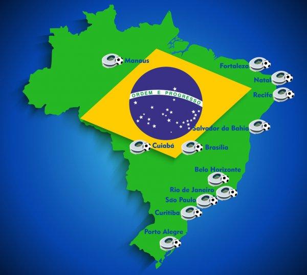 Maracanã,在巴西体育场地图上被正式称为Estádio Mário Filho,是为1950年世界杯而建的旗舰场馆。它是为了成为世界上最大的足球场。20世纪50年代初,圣保罗开始寻找新的体育场址。他们最终设法在Morumbi地区购买了一块土地,当时还是在城市外的森林和沼泽地的居住区。Estádio Nacional de Brasília Mané Garrincha被建成为巴西新的国家体育场,并成为2014年世界杯的比赛场地之一。Mineirão,正式名称为Estádio Governador Magalhães Pinto,是为了给贝洛奥里藏特市提供一个更大的替代Estádio Independência,当时该市的主要场地。