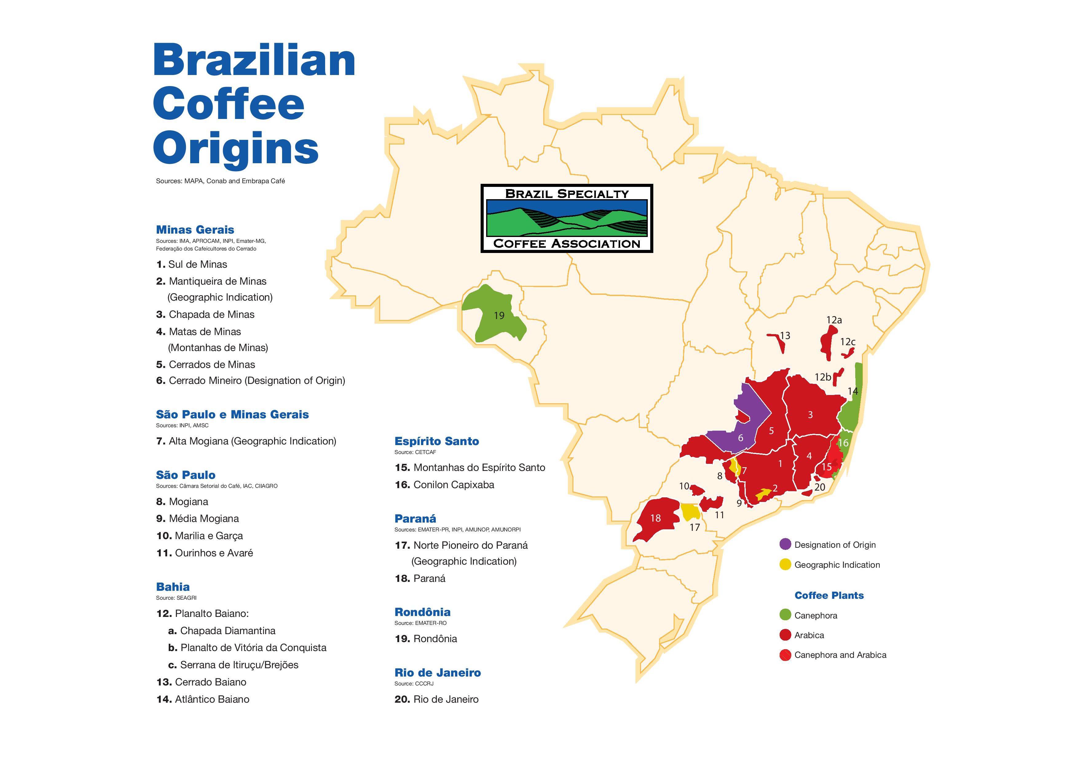 在巴西咖啡地图中提到,巴西有大约30万个咖啡种植园,分布在13个州。巴西的咖啡通常以这些形式出口。绿咖啡、研磨及烘焙咖啡、可溶性咖啡、浓缩/精华提取物、咖啡渣。巴西种植的咖啡主要是阿拉比卡品种,约占总作物的80%。收获季节从5月到8月。